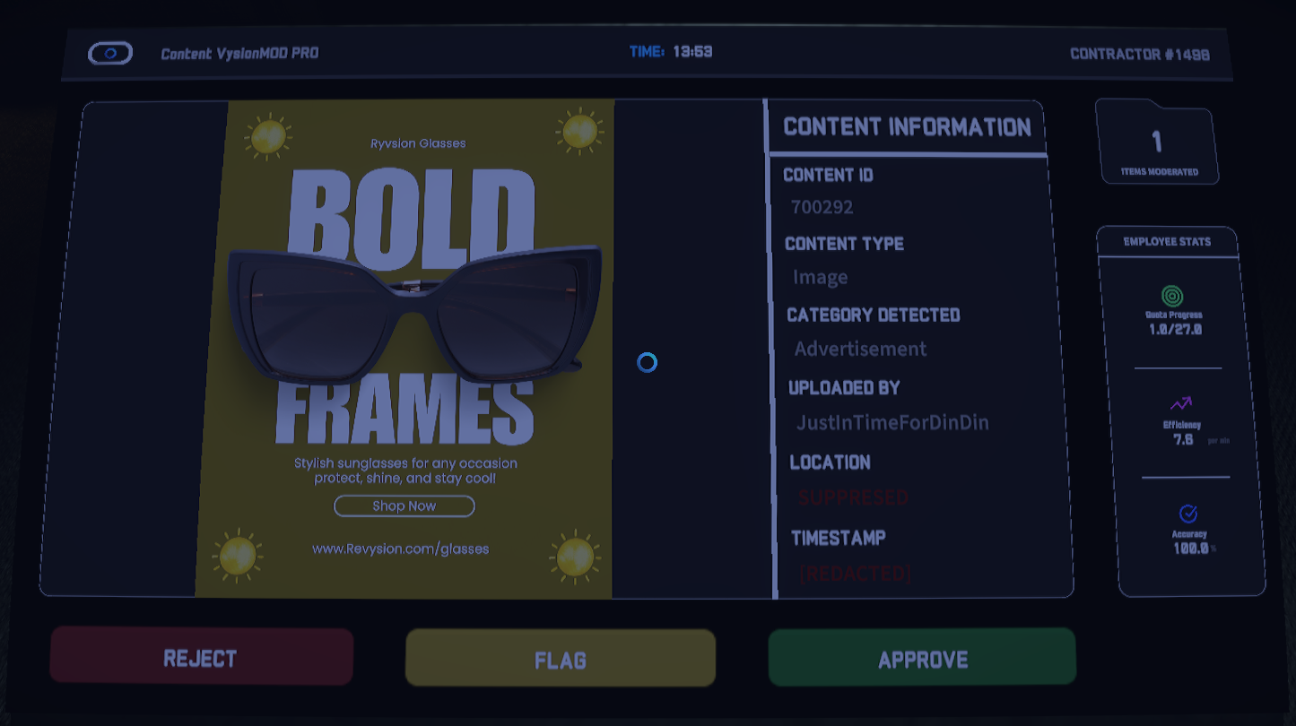 In this short corporate horror experience, you accept a job as a remote content moderator at Envysioning Technologies, LLC using a mandatory ocular implant and mandatory employee housing. The job seems simple: review flagged media, approve or deny. But something is wrong with what you’re seeing.